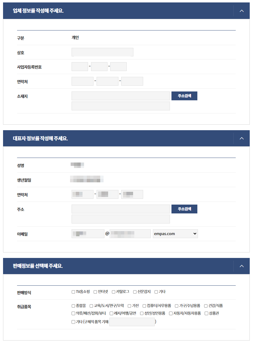 정부24통신판매업신고양식에 업체정보/대표자정보/판매정보를 입력합니다.