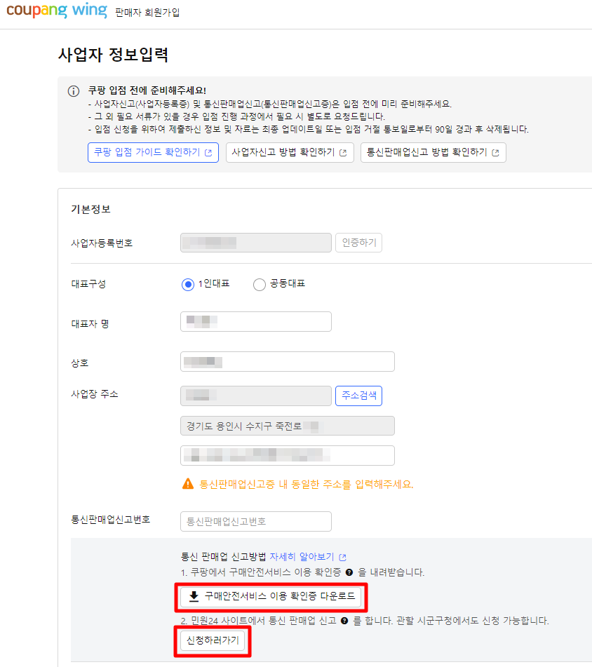약관에 동의하고 가입하기 하면 쿠팡윙(쿠팡판매자사이트)에 가입이 완료 됩니다.