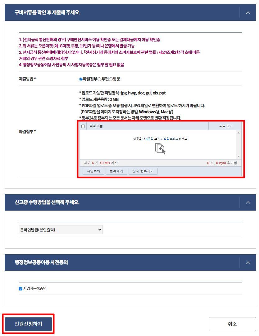 구매안전서비스 이용확인증 및 사업자등록증을 첨부하신후 민원 신청하기를 하시면 됩니다.