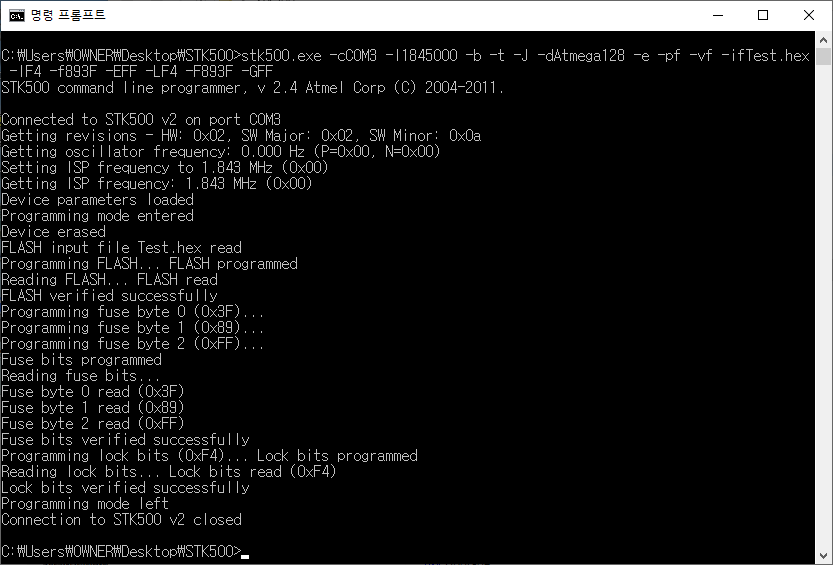 stk500.exe -cCOM3 -I1845000 -b -t -J -dAtmega128 -e -pf -vf -ifTest.hex -lF4 -f893F -EFF -LF4 -F893F -GFF