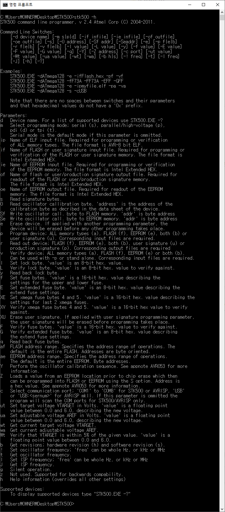 옵션에 대한 자세한 내용은 stk500 -h 명령어로 확인할 수 있습니다.