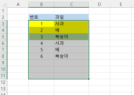 위의 중복값제거시에 번호 중복값을 삭제할지, 번호와 과일중복값을 삭제할 지 지정할 수 있습니다.