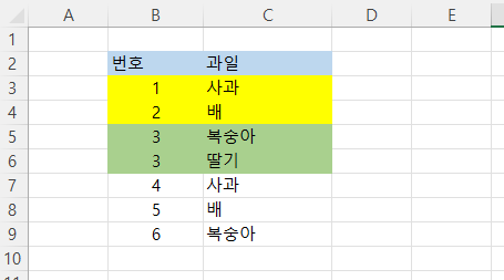아래와 같이 1,2번은 번호와 과일이 모두 동일합니다.